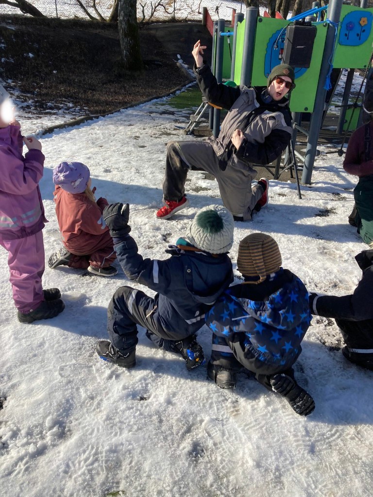 Denne aktiviteten gikk veldig bra. Barna elsker å danse sammen med min kollega og han elsker å danse med barna. Med rockemusikk på full guffe og en super entusiastisk voksen som lever seg helt inn i dansen blir barna med, glemmer tid og sted og danser til lua må av og luggen er svett. Det er morsomt, krevende, samlende og fin- og grov motorisk trening å danse.